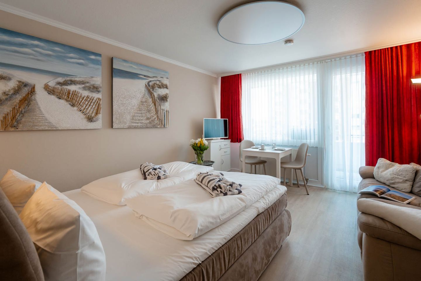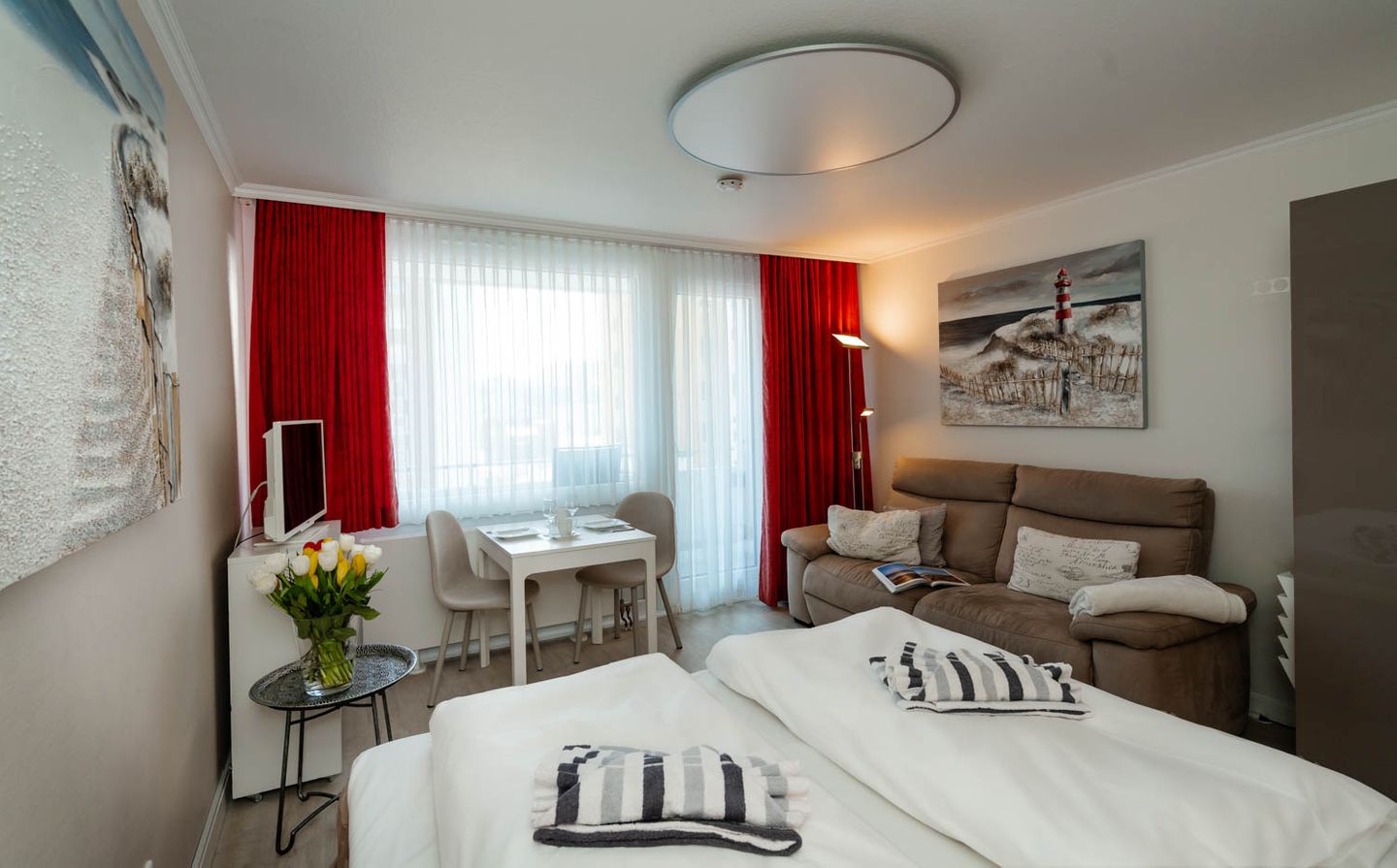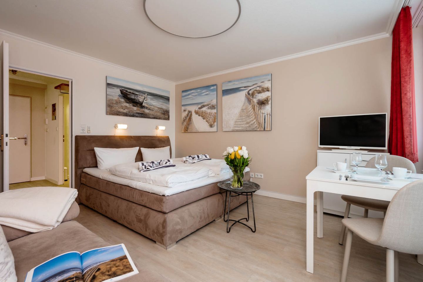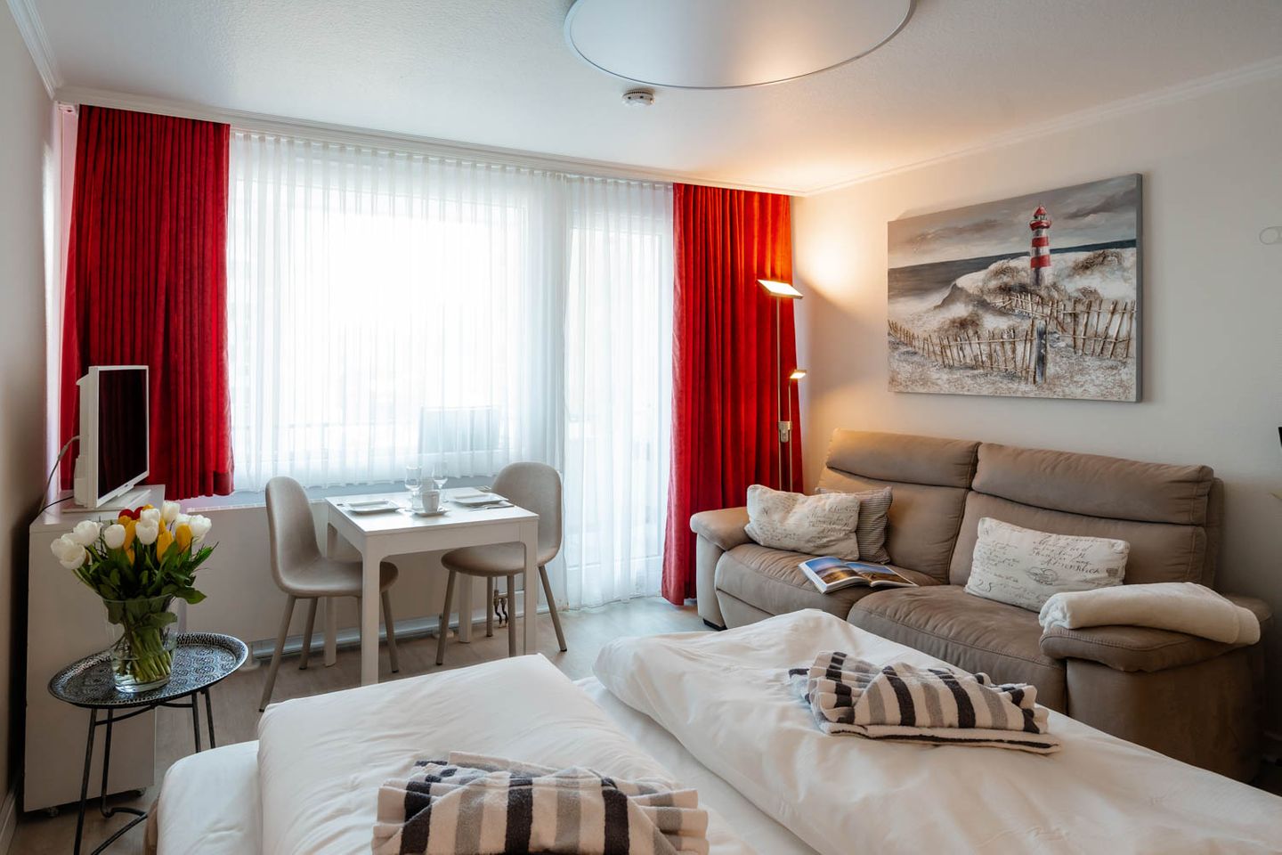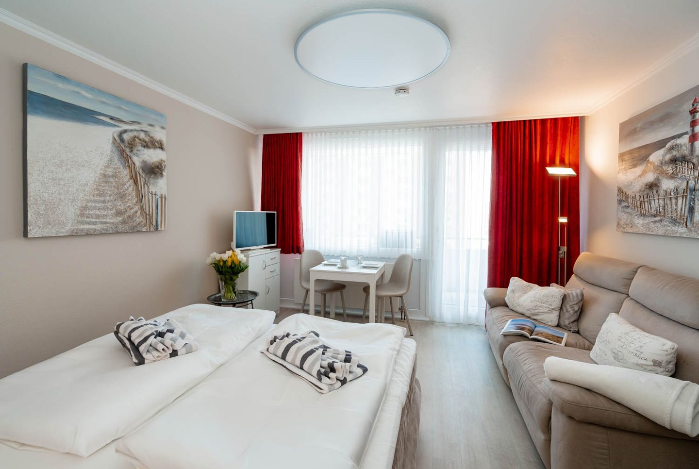 Wie cool: "Arielle", unsere charmante kleine Meerjungfrau im großen Ferienwohnungs-Angebot, hat sich jetzt richtig schick gemacht. Nach kompletter Renovierung im Frühsommer 2018 hat sie jetzt ihren ganz eigenen frischen und nordisch-klaren Stil mit der lichten Trendfarbe Greige, viel Weiß und roten Farbakzenten. Komplett wird der Insellook mit attraktiven maritimen Leinwänden Sylter Motive. Unverändert blieben natürlich die ursprünglichen Stärken dieser 25 Quadratmeter großen Ferienwohnung. Sie liegt im zweiten Stock eines Westerländer Appartementhauses und hat schon immer zahlreiche Fans wegen ihrer "perfekten" Lage: Innenstadt, Fußgängerzonen und der Strandübergang bei der Sylter Welle liegen quasi direkt vor der Haustür. "Arielle" ist einfach perfekt für zwei, nicht nur für Meerjungfrauen.