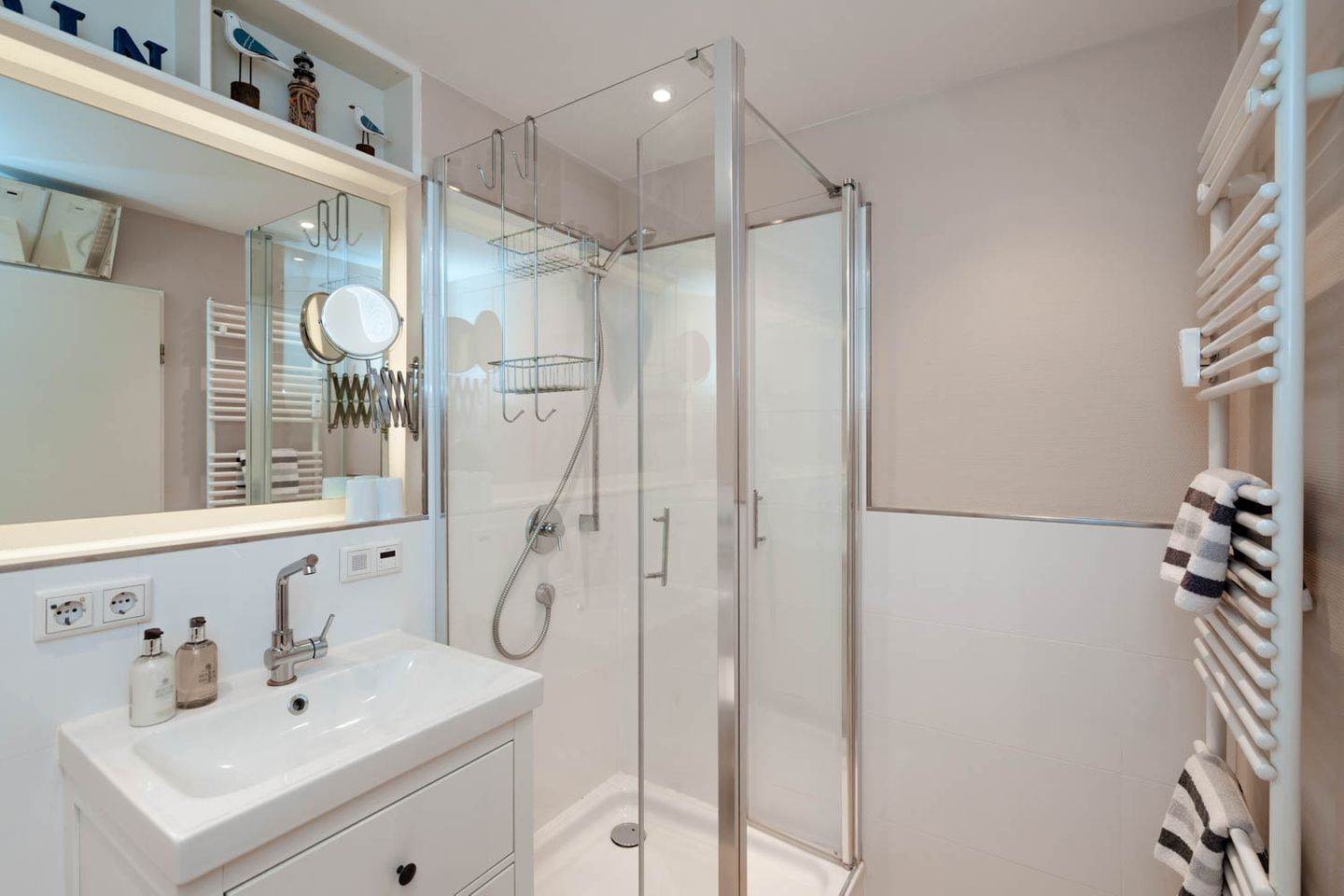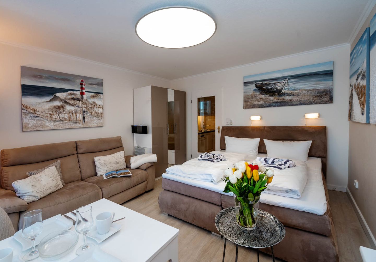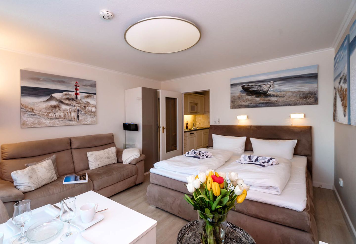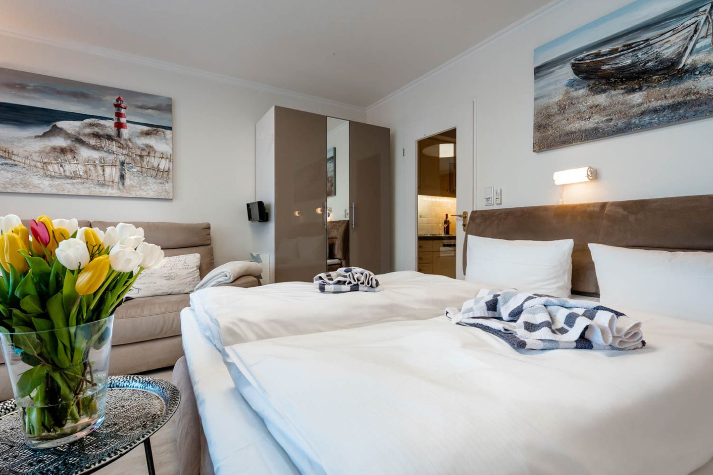Wie cool: "Arielle", unsere charmante kleine Meerjungfrau im großen Ferienwohnungs-Angebot, hat sich jetzt richtig schick gemacht. Nach kompletter Renovierung im Frühsommer 2018 hat sie jetzt ihren ganz eigenen frischen und nordisch-klaren Stil mit der lichten Trendfarbe Greige, viel Weiß und roten Farbakzenten. Komplett wird der Insellook mit attraktiven maritimen Leinwänden Sylter Motive. Unverändert blieben natürlich die ursprünglichen Stärken dieser 25 Quadratmeter großen Ferienwohnung. Sie liegt im zweiten Stock eines Westerländer Appartementhauses und hat schon immer zahlreiche Fans wegen ihrer "perfekten" Lage: Innenstadt, Fußgängerzonen und der Strandübergang bei der Sylter Welle liegen quasi direkt vor der Haustür. "Arielle" ist einfach perfekt für zwei, nicht nur für Meerjungfrauen.