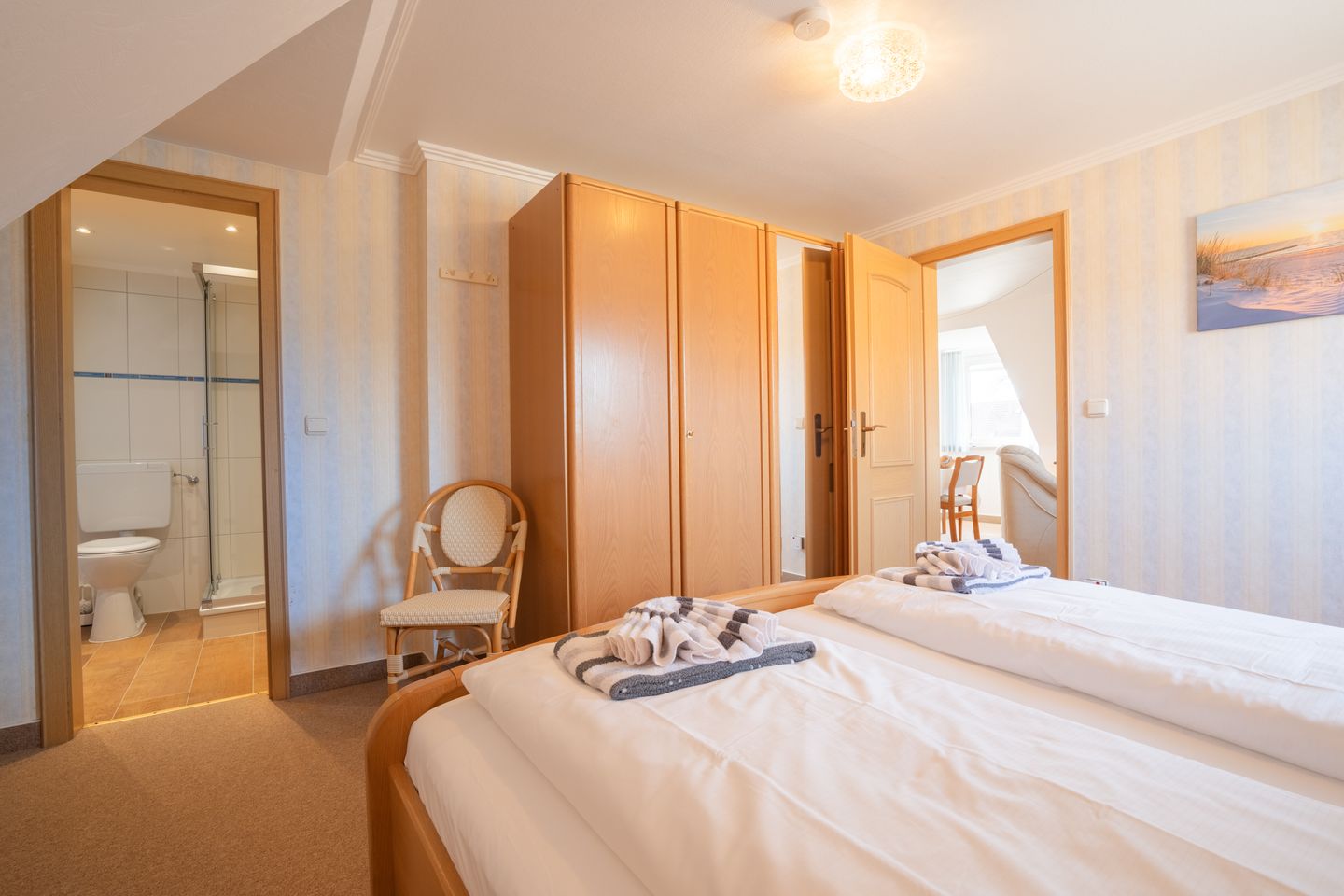 Das gemütliche Appartement "Jule" befindet sich im ersten Stock eines Privathauses im ruhigen, grünen Alt-Westerland. Von hier aus sind Sie in etwa 10 bis 15 Minuten zu Fuß am Westerländer Strand oder im Kurzentrum, die Innenstadt liegt sogar noch etwas näher. "Jule" ist circa 50 Quadratmeter groß, hat einen großen, eingewachsenen Garten zur Mitbenutzung mit Liegewiese, Terrasse und Strandkörben.Noch heute gibt's an der Promenade Kurkonzerte im Sommer, die hölzerne Wandelbahn, architektonische Zeugnisse aus der Bäderzeitblütephase und die echten Friesenkekse, nach Originalrezept von 1888 gebacken, im Cafe Wien in der Strandstraße. Die Friedrichstraße bietet alles, was man erwarten darf, wenn Shopping und Essengehen zur Entspannung gehören, die umliegenden Häuser voller Ferien-Appartements bestechen teilweise mit grandiosem Panoramablick über Stadt und/oder die Nordsee.