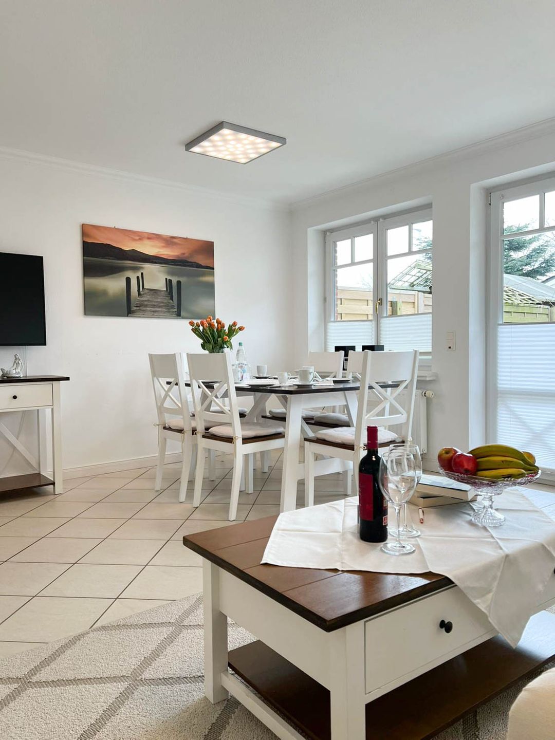 Im Herzen der Wohnung empfängt Sie ein helles, gemütlich eingerichtetes Wohnzimmer mit einer einladenden Couch und einem großzügigen Essplatz für gemeinsame Mahlzeiten. Von hier aus gelangen Sie direkt auf die sonnige Terrasse, wo Sie entspannte Stunden im Grünen verbringen und die Nachmittagssonne genießen können.